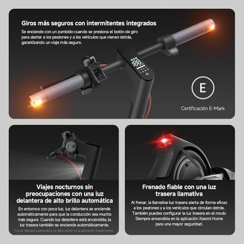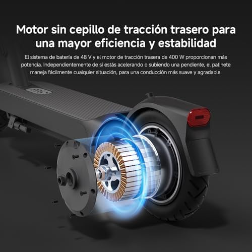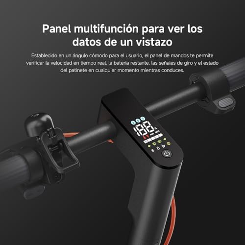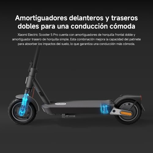 Acerca de este producto Mayor potencia y mejor rendimiento: Equipado con un motor de 400W (1000W de potencia máxima), el Xiaomi Electric Scooter 5 Pro ofrece una aceleración mejorada y mayor eficiencia en todo tipo de terrenos. Domina las pendientes sin esfuerzo: Con una capacidad de inclinación máxima del 22%, sube cuestas con mayor facilidad en comparación con otros modelos. Suspensión de doble tubo: Absorbe impactos y vibraciones para un viaje más cómodo y estable, sin importar el tipo de superficie. Sistema de frenado seguro y eficiente: Incorpora un freno de tambor delantero y sistema E-ABS trasero, proporcionando estabilidad y seguridad en todo momento. Autonomía de hasta 60 km: Gracias a su batería de 10.2 Ah/477 Wh, recorre largas distancias con una sola carga y sin preocupaciones.
